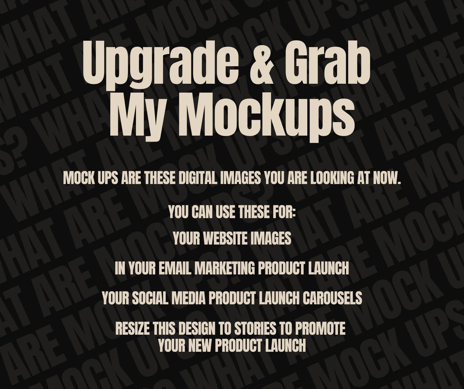 Mockups are these digital images you see now, showing you what the product looks like on my website. You can buy my mockups if you struggle to create your own of don’t have lots of time. We have done all the hard work for you!